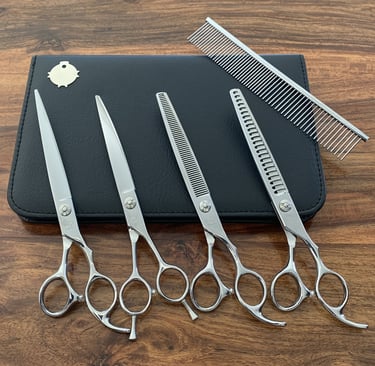 Our carefully curated range of professional grooming scissors are exclusively made from Japanese 440C steel. Highly regarded for its exceptional durability and sharpness, the high carbon content of 440C steel results in blades that maintain a keen edge for longer, allowing for precise and effortless cutting, even on thick or coarse animal fur.